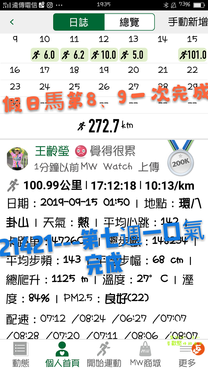 在第二期中後段我們開始互相激勵和挑戰,連續挑戰14天每天跑22、66公里成功,在尾聲時還挑戰了7天的每天24、6公里的成果!真的很開心,因為有大家一起推坑一起激勵的當中一直不斷更新自己的挑戰!