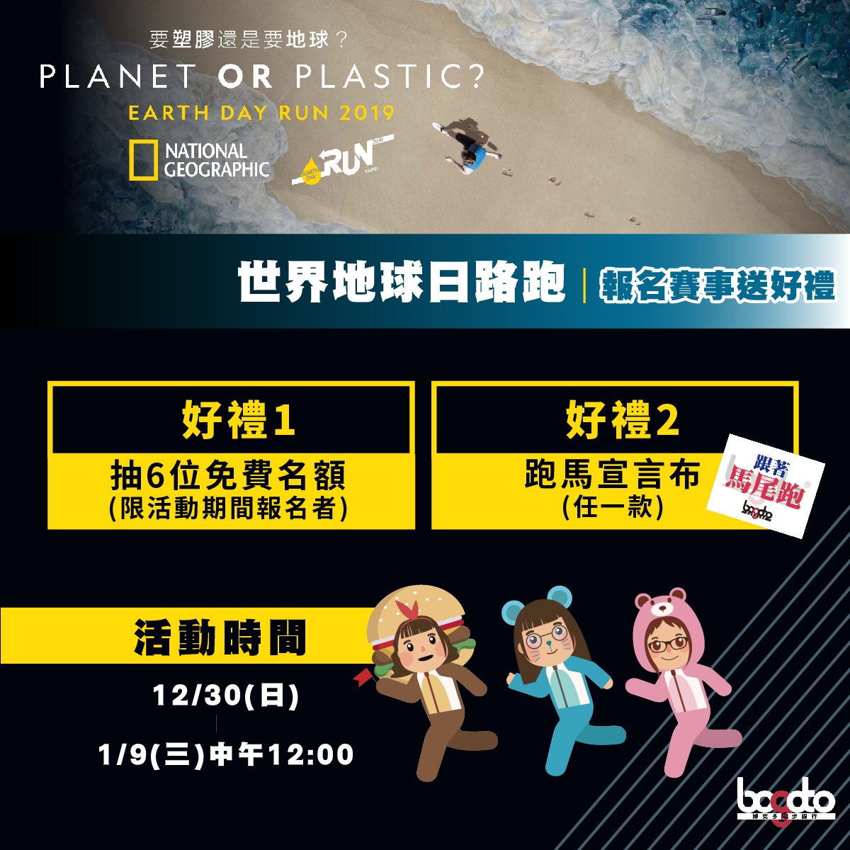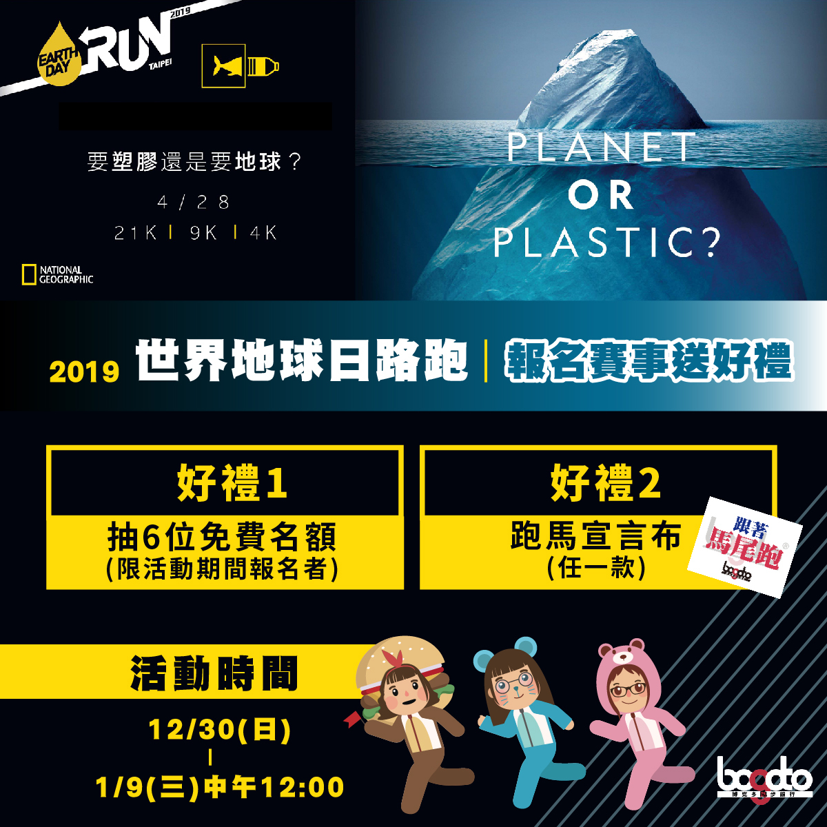 1/9(三)中午12點前報名2019世界地球日路跑,即可獲得跑馬宣言布(一張)
