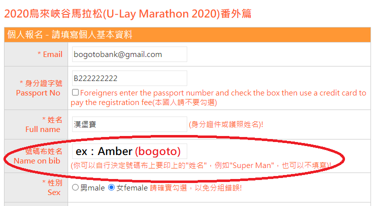 STEP2. 於報名表 「號碼布姓名」欄中,填入姓名並加上「bogoto」(可見下方範例圖)