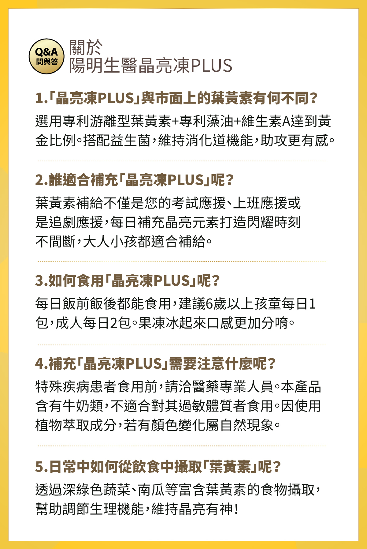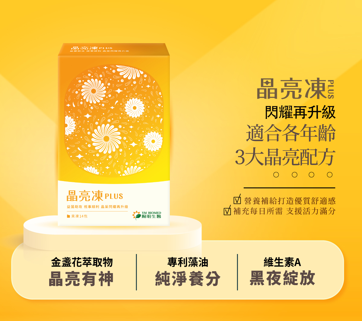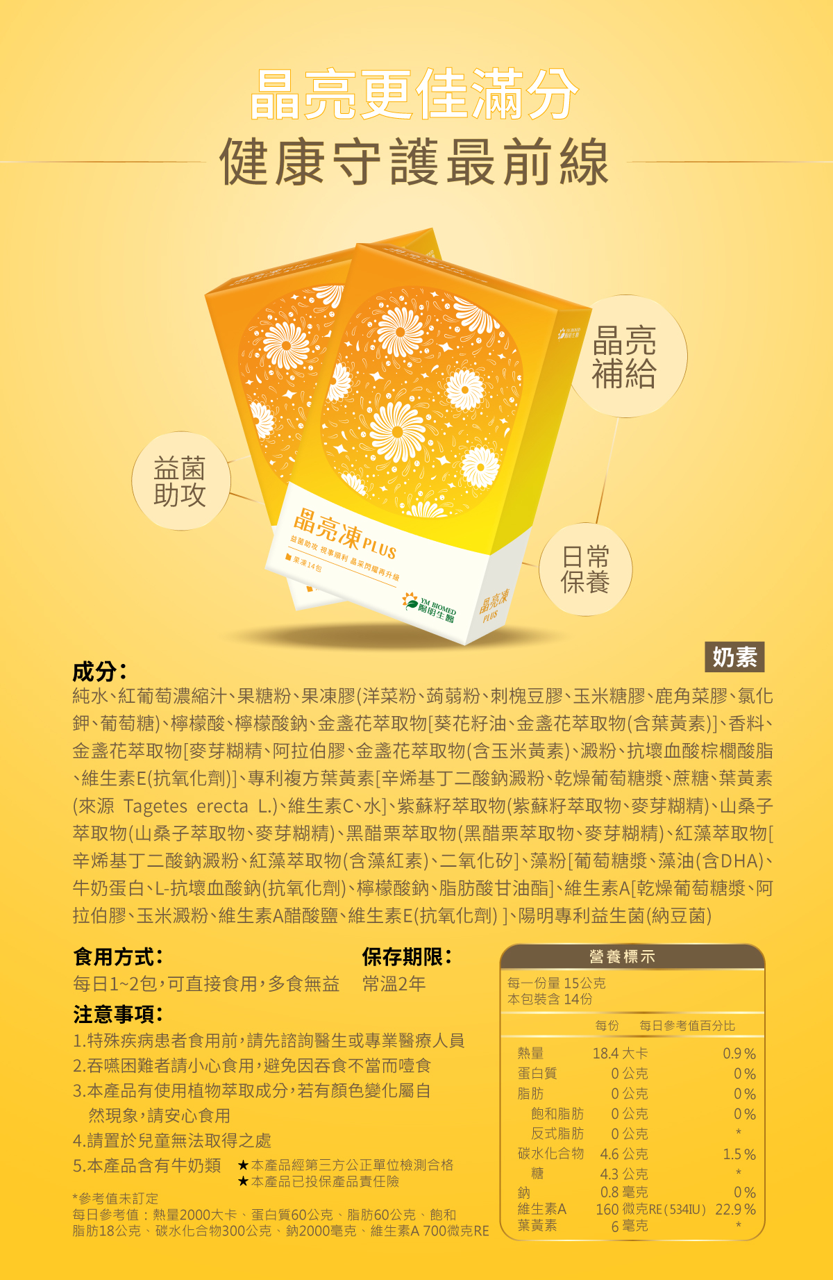 ● 晶亮凍PLUS:含有葉黃素與蝦紅素,幫助減緩用眼疲勞。