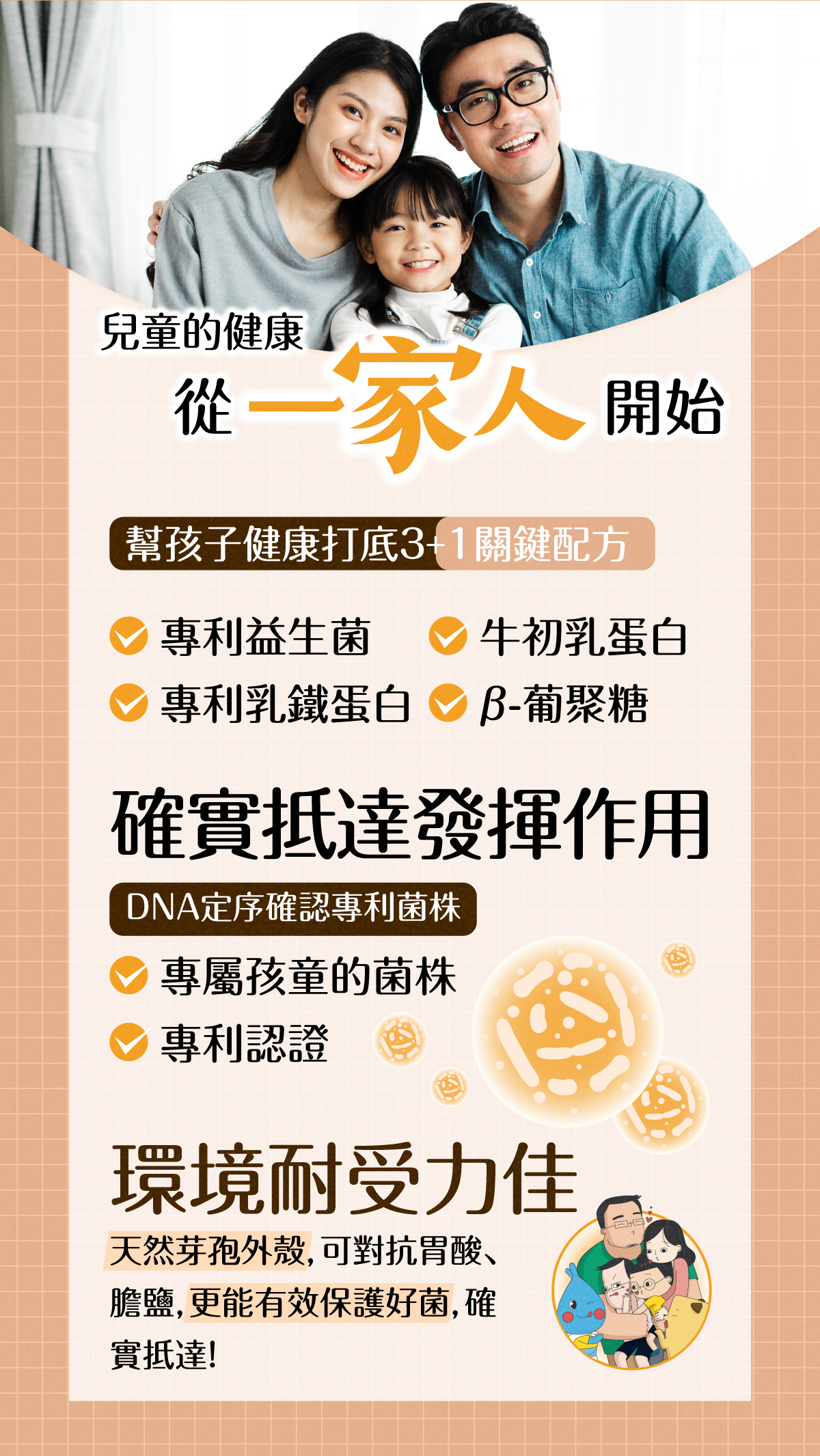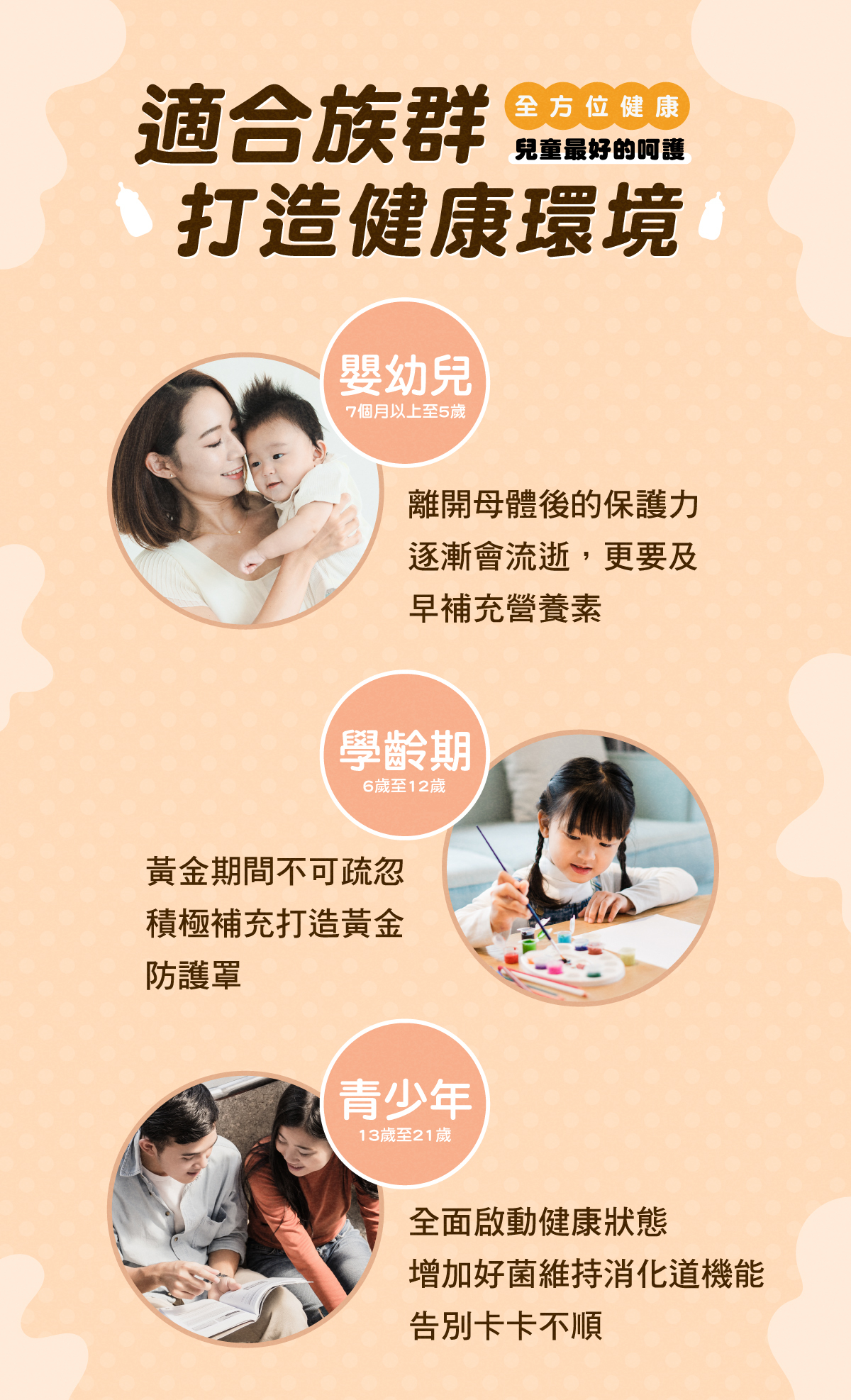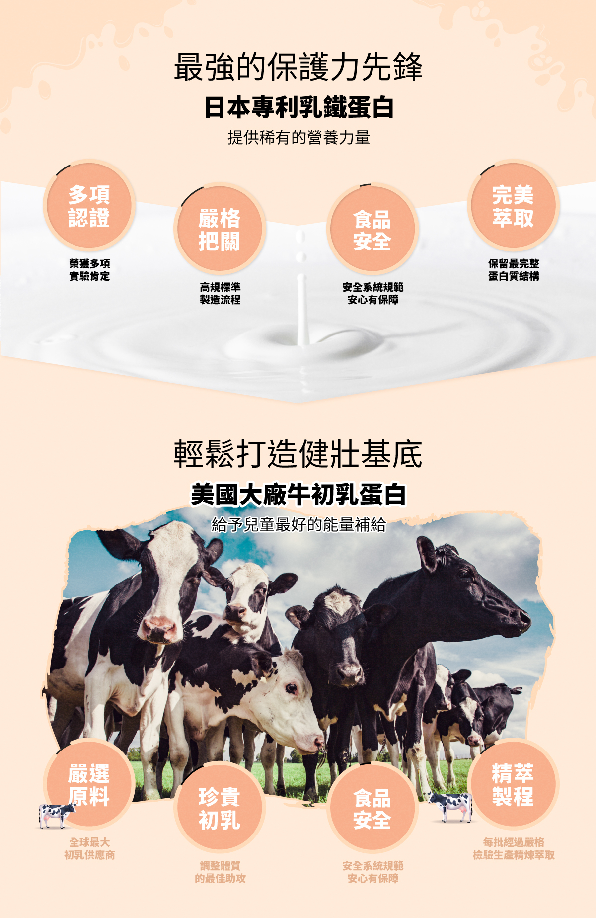● 專利益生菌+乳鐵蛋白+牛初乳蛋白+β-葡聚糖:全方位守護,體質打好底,給成長期孩子最全的保護力。